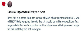 Ingo Swann *(original Stargate project) and I were given the 1st time seen surface photos of the really cool secret material on Mars, with a jpl fax daily. This was prior to my being trained by Military/intel as a Deep Black/remote viewer.